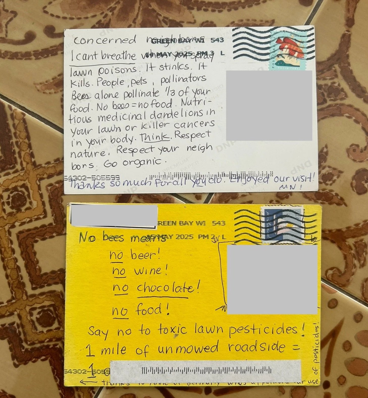 Examples of Mother Nature’s post cards to residents who use pesticides, warning them of the dangers that come with the practice. Photos by Lauren Knisbeck.