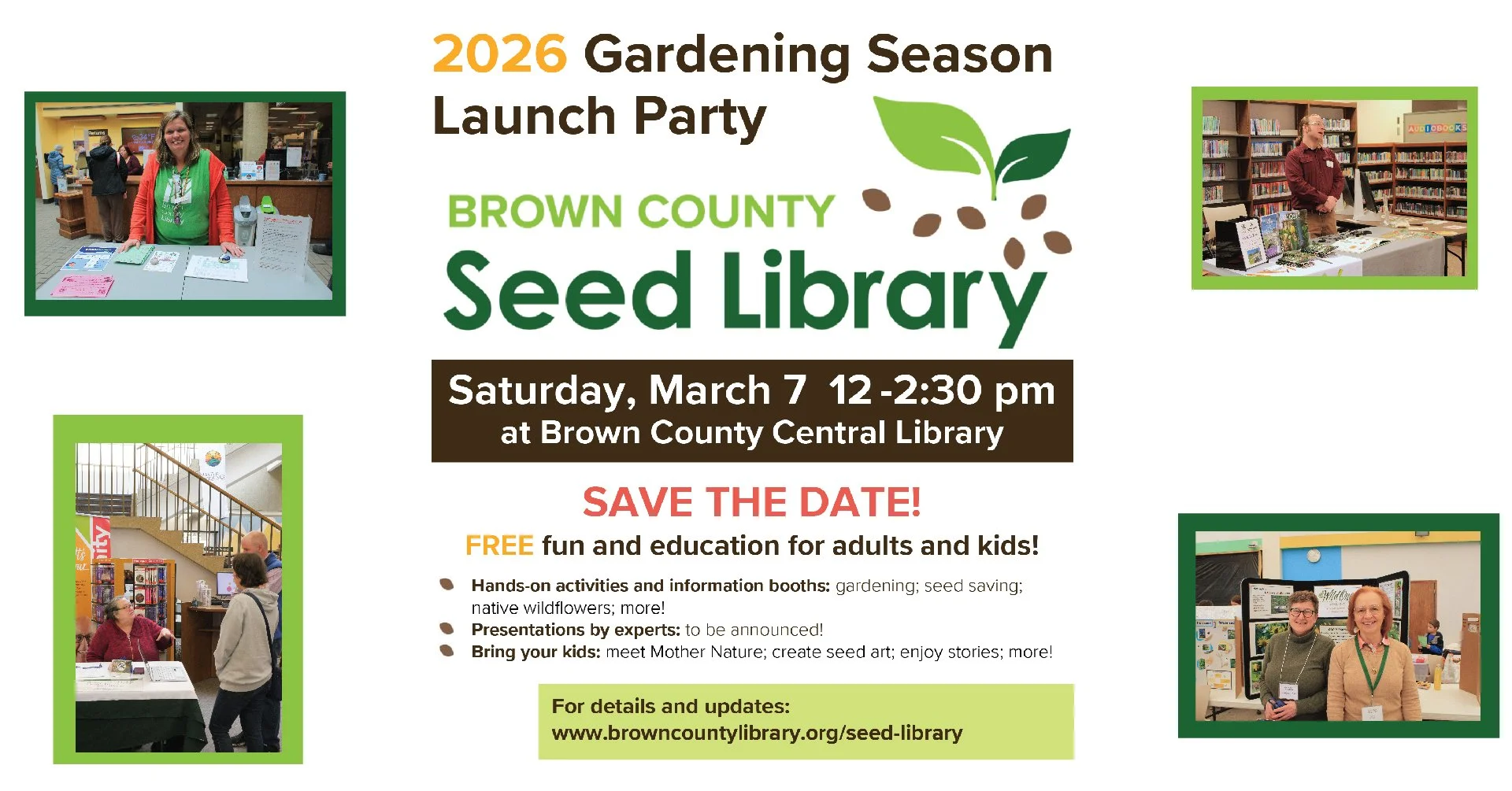 Kick off the fourth growing season for the Brown County Seed Library with fun and learning for all ages! Drop in for presentations by experts, hands-on activities and crafts, information booths, and more, with a focus on seeds, gardening and healthy eating.